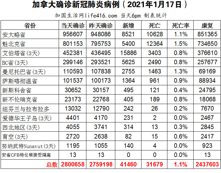 【加国生活网编译报道】截至2022年1月17日下午6点,加拿大新冠确诊病例总数为2800658(3天新增41460,当天新增26316),死亡31679(新增149)。安省确诊总数956607(新增8521);魁省确诊总数801153(新增5400);艾省确诊总数452381(3天新增15886,当天新增6293);BC省确诊总数299146(3天新增5625,当天新增1509);曼省确诊总数110593(3天新增2755,当天新增1320);萨省确诊总数101537(新增1364);新斯科舍省确诊总数30652(新增495);新不伦瑞克省确诊总数23173(新增405);纽芬兰与拉布拉多省确诊总数13032(新增242)。加拿大卫生部宣布批准辉瑞公司的生产新冠口服药Paxlovid,正值加拿大医院不堪重负之际,该口服药的推出为加拿大卫生系统挽救更多的生命铺平了道路;安省住院患者增涨速度正在放慢;安省扩大了可免费进行PCR检测的适用人群,新增了四类人群。加国生活网专门制作了如下统计数据表: