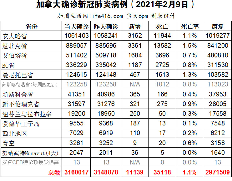 【加国生活网编译报道】截至2022年2月9日下午6点,加拿大新冠确诊病例总数为3160017(新增11139),死亡35118(新增149)。安省确诊总数1061403(新增3162);魁省确诊总数889057(新增3361);艾省确诊总数511402(新增1684);BC省确诊总数336229(新增1187);曼省确诊总数124615(新增467)。加拿大许多省份表示不会急于效仿艾省和萨省迅速放弃疫苗护照和室内口罩要求;安省宣布将扩大快速检测的范围,并从当天开始在杂货店、药店和其他场所分发快速抗原检测盒,每个家庭限领一盒(包括5个测试盒)。加国生活网专门制作了如下统计数据表: