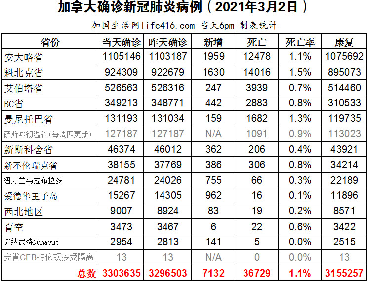 【加国生活网编译报道】截至2022年3月2日下午6点,加拿大新冠确诊病例总数为3303635(新增7132),死亡36729(新增91)。安省确诊总数1105146(新增1959);魁省确诊总数924309(新增1630);艾省确诊总数526563(新增247);BC省确诊总数349213(新增442);曼省确诊总数131193(新增159)。加拿大央行在3月3日将基准利率上调至 0.5%,预计这将是今年一系列小幅加息中的第一次,此举旨在抑制已升至数十年来最高点的通胀,这是加拿大央行自2018年以来首次提高利率,更不用说还是在新冠疫情期间了;美国的一项针对17名长期新冠患者进行深入检查的研究显示,在感染新冠病毒后三个月内,这些患者出现神经损伤,并持续至少两个月。加国生活网专门制作了如下统计数据表: