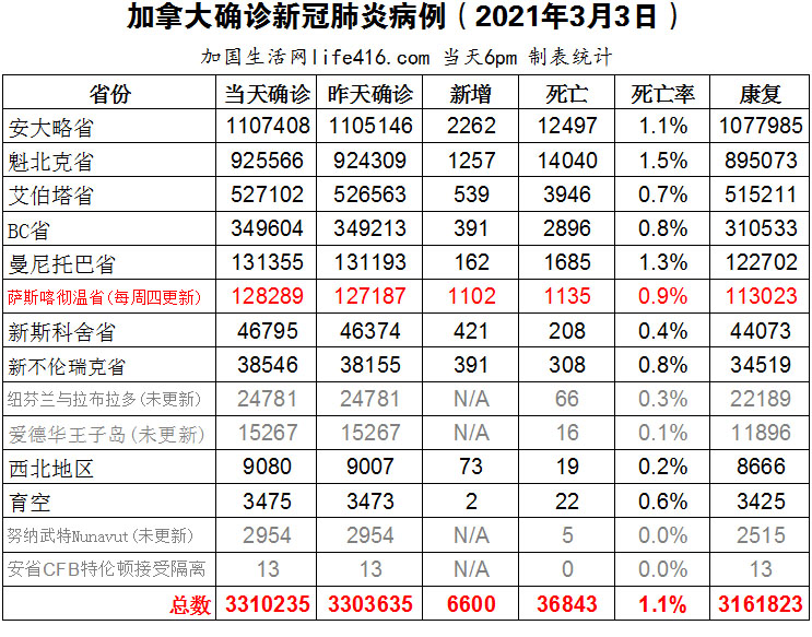 【加国生活网编译报道】截至2022年3月3日下午6点,加拿大新冠确诊病例总数为3310235(新增6600),死亡36843(新增114)。安省确诊总数1107408(新增2262);魁省确诊总数925566(新增1257);艾省确诊总数527102(新增539);BC省确诊总数349604(新增391);曼省确诊总数131355(新增162)。安省首席卫生官Kieran Moore博士表示,安省可能会在3月底前取消口罩强制令,尽管安省新冠确诊病例的实际数量可能是通过PCR检测确诊量的10倍。该消息发布之际,安省报告当天新增2262例确诊病例,有834例新冠住院患者,另有19例死亡病例。加国生活网专门制作了如下统计数据表: