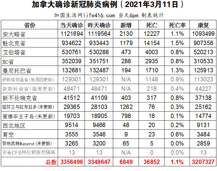 【加国生活网编译报道】截至2022年3月11日下午6点,加拿大新冠确诊病例总数为3356496(新增6849),死亡36852(减少380,其中安省减少411)。安省确诊总数1121694(新增2130);魁省确诊总数934622(新增1179);艾省确诊总数530761(新增473);BC省确诊总数352039(新增288);曼省确诊总数132681(新增194)。安省卫生部在3月11日表示,自2020年1月15日以来,安省共有12,227例新冠死亡病例,比昨天安省卫生部公布的数字减少了411例。安省卫生部解释称,卫生部之所以在2022年3月11日更改了死亡人数,是因为在进一步的分析了一些死亡病例后,发现了一些死因与新冠病毒无关病例。加国生活网专门制作了如下统计数据表: