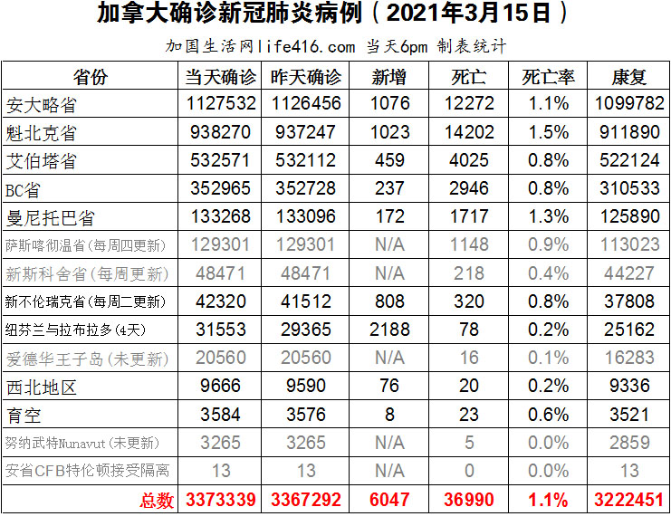 【加国生活网编译报道】截至2022年3月15日下午6点,加拿大新冠确诊病例总数为3373339(新增6047),死亡36990(增加46)。安省确诊总数1127532(新增1076);魁省确诊总数938270(新增1023);艾省确诊总数532571(新增459);BC省确诊总数352965(新增237);曼省确诊总数133268(新增172)。一项最新的民意调查显示,加拿大民众对加拿大应对新冠疫情的反应意见分歧很大,针对总理如何处理紧急情况的问题上,民意调查的意见不一,各省省民对省长的表现反应也不一样 。加国生活网专门制作了如下统计数据表: