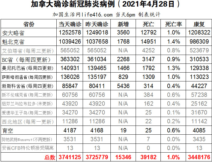 【加国生活网编译报道】截至2022年4月28日下午6点,加拿大新冠确诊病例总数为3741125(新增15346),死亡39182(新增175)。安省确诊总数1252578(新增3560);魁省确诊总数1039426(新增1768);BC省确诊总数363302(一周新增2268);曼省确诊总数140931(一周新增1466);萨省确诊总数136026(一周新增829);新斯科舍省确诊总数85847(一周新增5436)。Moderna公司在4月28日向美国监管机构申请授权为6个月至5岁的儿童接种低剂量疫苗,与此同时,该公司也正在向加拿大卫生部提交申请,用以批准其用于同样年龄组的儿童疫苗。加国生活网专门制作了如下统计数据表: