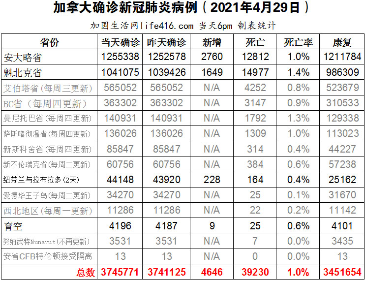 【加国生活网编译报道】截至2022年4月29日下午6点,加拿大新冠确诊病例总数为3745771(新增4646),死亡39230(新增48)。安省确诊总数1255338(新增2760);魁省确诊总数1041075(新增1649);纽芬兰与拉布拉多省确诊总数44148(2天新增228)。根据欧洲疾病预防和控制中心的统计,全球已经报告了近200例神秘肝炎病例。刚好辉瑞发布了第二份疫苗数据报道,其中包括不良反应激增的情况,再加上德国最近的一项研究发现,辉瑞疫苗可能引发肝炎,于是很多人开始对辉瑞疫苗的安全性感到担忧。加国生活网专门制作了如下统计数据表: