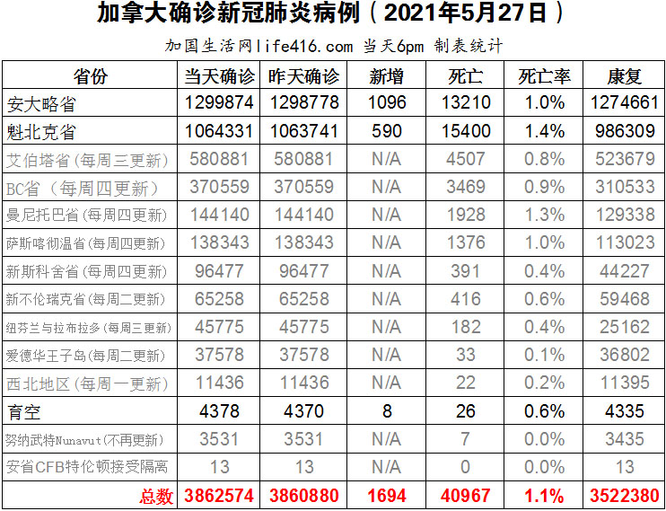 【加国生活网编译报道】截至2022年5月27日下午6点,加拿大新冠确诊病例总数为3862574(新增1694),死亡40967(新增25)。安省确诊总数1299874(新增1096);魁省确诊总数1064331(新增590)。艾省首席卫生官宣布发现了BA.4首例确诊病例,代表着Omicron亚变体BA.4已正式“杀”入艾伯塔省,是否会引发下一波疫情只能拭目以待。虽然医生和科学家们预计它可能会激发病例上升,但目前尚不清楚这种激增会有多剧烈,或者是否会给医院带来更大的压力。由于该省PCR检测受限制,目前很难知道BA.4到底感染了多少人。加国生活网专门制作了如下统计数据表: