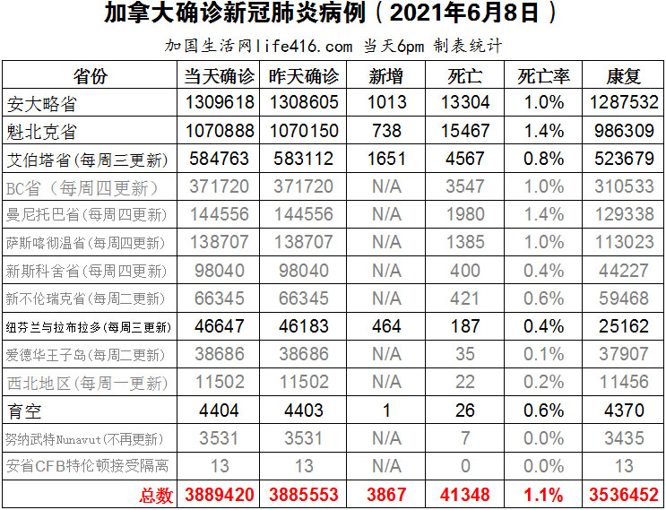 【加国生活网编译报道】截至2022年6月8日下午6点,加拿大新冠确诊病例总数为3889420(新增3867),死亡41348(新增34)。安省确诊总数1309618(新增1013);魁省确诊总数1070888(新增738);艾省确诊总数584763(一周新增1651);纽芬兰与拉布拉多省确诊总数46647(一周新增464)。安省首席卫生官Kieran Moore博士在6月8日的新闻发布会上宣布将从6月11日凌晨12点起取消大部分剩余的口罩强制令规定,包括取消在医院和公共交通中的口罩强制令,但在长期护理院和养老院中仍将强制要求戴口罩。加国生活网专门制作了如下统计数据表: