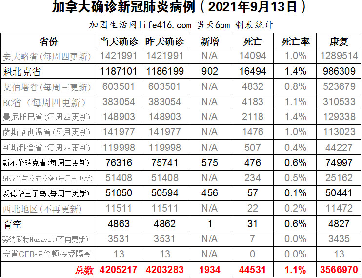 【加国生活网编译报道】截至2022年9月13日下午6点,加拿大新冠确诊病例总数为4205217(新增1934),死亡44531(新增16),魁省确诊总数1187101(新增902,死亡新增12);新不伦瑞克省确诊总数76316(新增575);爱德华王子岛确诊总数51050(新增456)。随着Moderna针对原始病毒和Omicron BA.1的二价疫苗正在加拿大各地推出,许多加拿大人疑惑现有的疫苗会被如何处理?加拿大联邦卫生部长承诺,随着最新疫苗的推出,加拿大会尽量减少任何疫苗的浪费。在整个新冠疫情期间,加拿大已经向其他国家捐赠了一些剩余的疫苗,之后加拿大将继续根据需要捐赠疫苗。加国生活网专门制作了如下统计数据表: