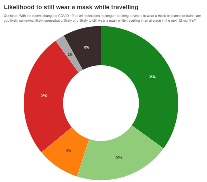 不过,仍有35%的受访者对这个问题的回答是负面的:26%的人表示,他们在乘飞机或乘火车旅行时不太可能(Unlikely)继续戴口罩,而 9% 的受访者表示不确定(Unsure)。