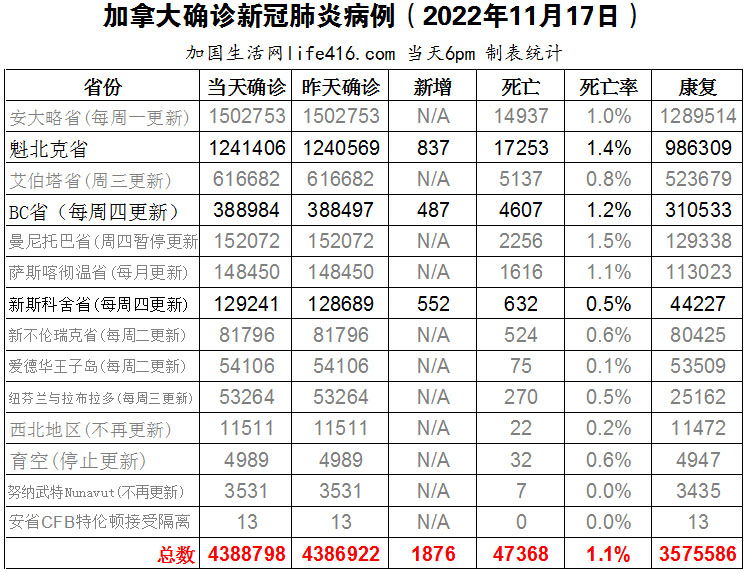 【加国生活网编译报道】截至2022年11月17日下午6点,加拿大新冠确诊病例总数为4388798(新增1876),死亡47368(新增79),魁省确诊总数1241406(新增837,死亡新增9)、BC省确诊总数388984(一周新增487,死亡新增55)、新斯科舍省确诊总数129241(一周新增552,死亡新增15)。由于安省各地医院报告称儿童病患激增让医院不堪重负,父母们不得不等待数小时才能让孩子得到救治,为此安省卫生部长Sylvia Jones为省府对医疗保健系统的处理进行了辩护,她表示安省最近将儿科重症监护病房的容量增加了30%。而且目前的数据表明,虽然流感和 RSV 病例仍在上升,但速度已经放缓。加国生活网专门制作了如下统计数据表: