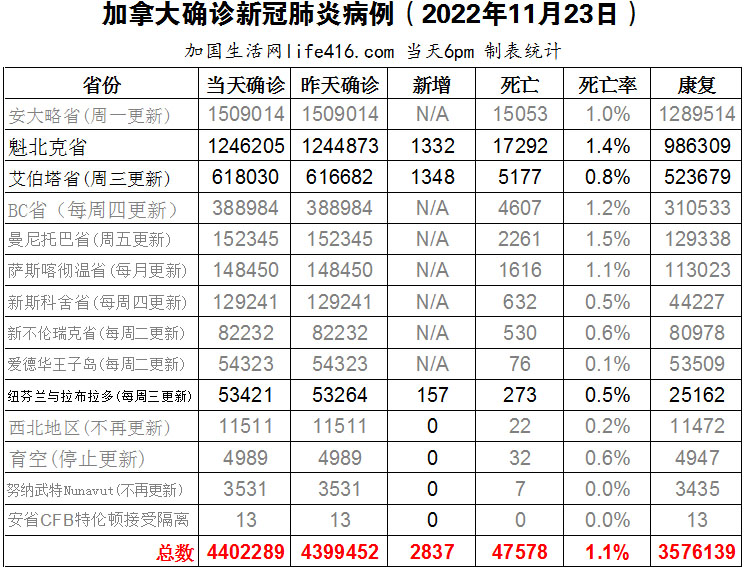 【加国生活网编译报道】截至2022年11月23日下午6点,加拿大新冠确诊病例总数为4402289(新增2837),死亡47578(新增45),魁省确诊总数1246205(新增1332,死亡新增2)、艾省确诊总数618030(一周新增1348,死亡新增40)、纽芬兰与拉布拉多确诊总数53421(一周新增157,死亡新增3)。随着世界杯赛事如火如荼地在卡塔尔举行,巴西正面临新一波新冠确诊病例的激增,许多巴西人挤进酒吧和餐馆观看比赛,助长了Omicron亚变体传播,公共卫生专家建议球迷在室内看球时戴上口罩,并采取一切必要的卫生预防措施以避免传染。加国生活网专门制作了如下统计数据表: