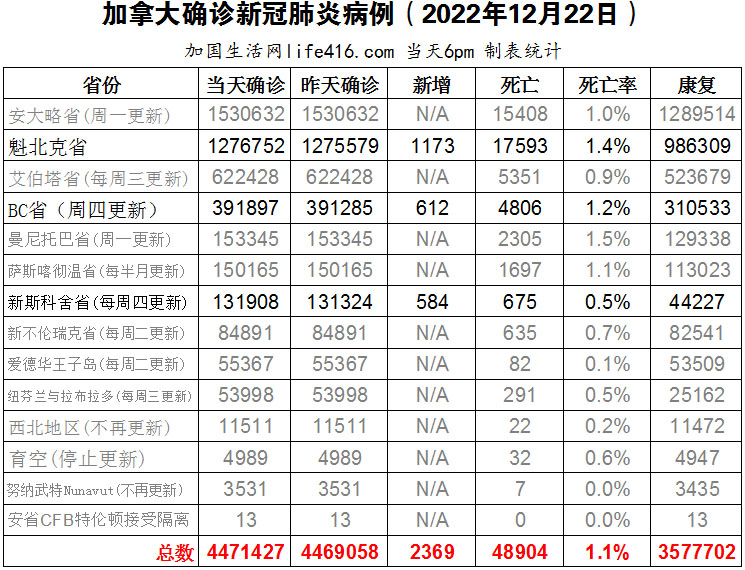 【加国生活网编译报道】截至2022年12月22日下午6点,加拿大新冠确诊病例总数为4471427(新增2369),死亡48904(新增55),魁省确诊总数1276752(新增1173,死亡新增7);BC省确诊总数391897(一周新增612,死亡新增46);新斯科舍省确诊总数131908(一周新增584,死亡新增2)。加拿大首席卫生官敦促国民“保持警惕”,新冠病毒仍在“相对较高的水平”传播,其他流感病毒株可能在新的一年激增。新冠和流感接下来会发生什么,很大程度上取决于人们在假期采取预防措施。加国生活网专门制作了如下统计数据表: