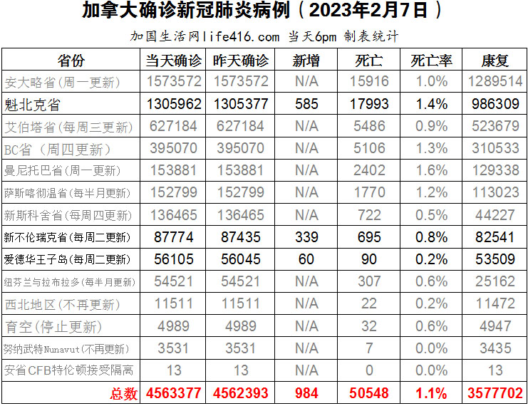 【加国生活网编译报道】截至2023年2月7日下午6点,加拿大新冠确诊病例总数为4563377(新增984),死亡50548(新增34),魁省确诊总数1305962(新增585,死亡新增26);新不伦瑞克省确诊总数87774(一周新增339,死亡新增6);爱德华王子岛确诊总数56105(一周新增60,死亡新增2)。安省卫生部的一份科学简报曾得出一项结论——在秋季呼吸道病毒激增时引入“口罩强制令”可能无法缓解儿科医院的压力。这份未主动公开的简报揭开了安省首席卫生官在去年11月中旬采取不发布“口罩强制令”而只是“强烈建议”戴口罩这一决定的背后故事。加国生活网专门制作了如下统计数据表: