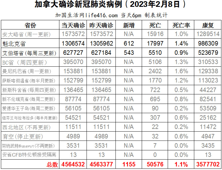 【加国生活网编译报道】截至2023年2月8日下午6点,加拿大新冠确诊病例总数为4564532(新增1155),死亡50576(新增28),魁省确诊总数1306574(新增612,死亡新增4);艾省确诊总数627727(一周新增543,死亡新增24)。加拿大的一项研究表明,在怀孕期间接种新冠疫苗可以防止新生儿感染和住院。该研究于2月8日发表在英国医学杂志(BMJ)上,研究发现当母亲在怀孕期间接种第二剂或第三剂mRNA疫苗对婴儿面对新冠病毒的保护最为有效。加国生活网专门制作了如下统计数据表: