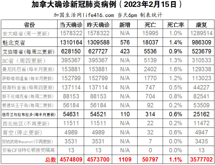 【加国生活网编译报道】截至2023年2月15日下午6点,加拿大新冠确诊病例总数为4574809(新增1109),死亡50797(新增40),魁省确诊总数1310164(新增576,死亡新增7);艾省确诊总数628150(一周新增423,死亡新增26);纽芬兰与拉布拉多省确诊总数54631(一周新增110,死亡新增7)。加拿大公共卫生部官员证实,在新冠疫情渐渐平息之后,传染性极强的诺如病毒(Norovirus)开始在加拿大呈上升趋势,该病毒以引起严重的胃痛、呕吐、腹泻、虚弱和脱水等症状而闻名。加国生活网专门制作了如下统计数据表: