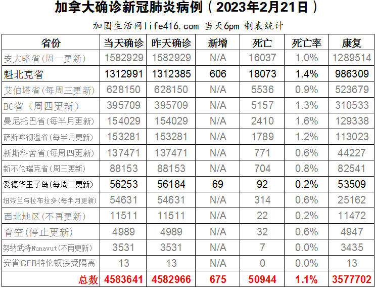 【加国生活网编译报道】截至2023年2月21日下午6点,加拿大新冠确诊病例总数为4583641(新增675),死亡50944新增10),魁省确诊总数1312991(新增606,死亡新增10);爱德华王子岛确诊总数56253(一周新增69)。虽然新冠疫情最严重时期似乎已经过去,但医院现在正在处理新冠病毒感染的后遗症,因为越来越多的研究表明病毒与心脏相关问题之间存在联系,尤其是在年轻人中。心脏病专家认为新冠病毒确实会通过多种机制影响心脏,那中医理论如何解释?加国生活网专门制作了如下统计数据表: