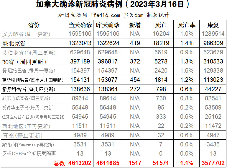 【加国生活网编译报道】截至2023年3月16日下午6点,加拿大新冠确诊病例总数为4613202(新增1517),死亡51571(新增57),魁省确诊总数1323043(新增419,死亡新增4);BC省确诊总数3971898(一周新增372,死亡新增29);萨省确诊总数154131(一周新增454,死亡新增17);新斯科舍省确诊总数138636(一周新增272,死亡新增7)。一项针对 1,400 多名感染新冠的加拿大儿童的新研究发现,发烧和咳嗽与 Omicron 和 Delta 变体的相关性更大。与感染 Delta 的儿童相比,感染 Omicron 的儿童更有可能重复去急诊就医。加国生活网专门制作了如下统计数据表: