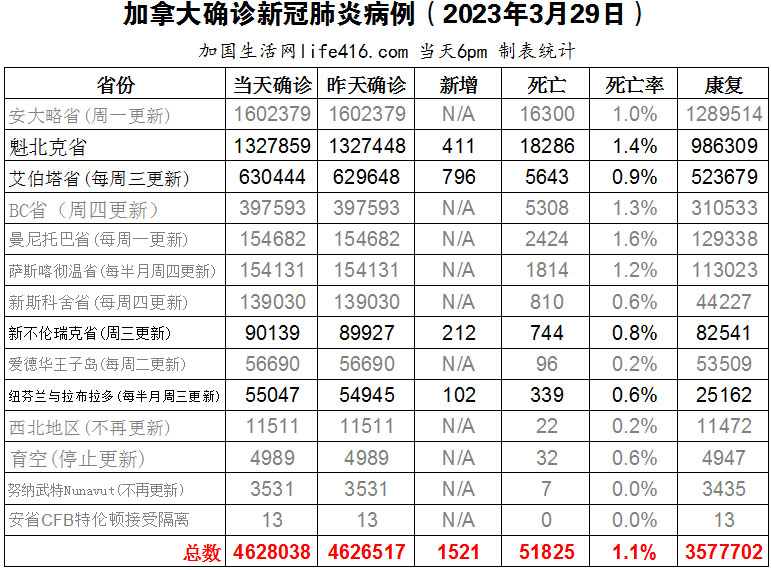 【加国生活网编译报道】截至2023年3月29日下午6点,加拿大新冠确诊病例总数为4628038(新增1521),死亡51825(新增43),魁省确诊总数1327859(新增411,死亡新增7);艾省确诊总数630444(一周新增796,死亡新增24);新不伦瑞克省确诊总数90139(一周新增212,死亡新增6);纽芬兰与拉布拉多省确诊总数55047(一周新增102,死亡新增6)。世界卫生组织WHO针对新冠疫情的新阶段量身定制了新冠疫苗接种建议——健康的儿童和青少年可能不一定需要接种新冠疫苗,但年龄较大的高危人群应在最后一次接种疫苗后的6至12个月内接种加强剂疫苗。加国生活网专门制作了如下统计数据表: