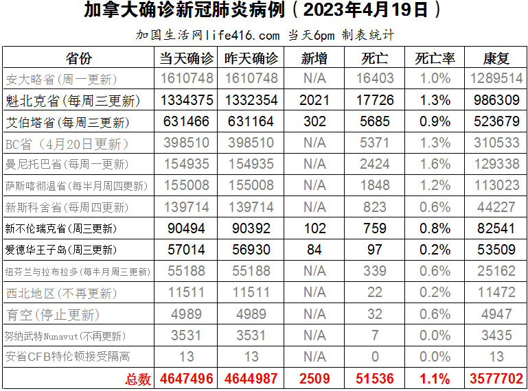 鉴于魁省改为每周更新数据和BC省5月4日停止更新数据,其他各省数据也是不稳定列新,加国生活网每日疫情报道从4月18日起改为每周一次或两次报道,根据各省的数据更新情况而定,请大家理解!