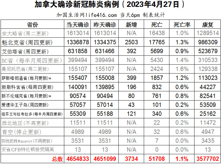 【加国生活网编译报道】截至2023年4月27日下午6点,加拿大新冠确诊病例总数为4654833(新增3734),死亡51708(新增69例),魁省确诊总数1336878(一周新增2503,死亡新增39);艾省确诊总数631858(一周新增392,死亡新增14);萨省确诊总数155407(一周新增399,死亡新增9);新斯科舍省确诊总数140091(一周新增196);新不伦瑞克省确诊总数90574(一周新增80,死亡新增2);爱德华王子岛确诊总数57057(一周新增43,死亡新增4);纽省确诊总数55309(一周新增121,死亡新增1)。加拿大艾伯塔省卫生部宣布于2023年3月31日确诊了首例XBB.1.16病例,截止4月9日,已确诊11例。加国生活网专门制作了如下统计数据表: