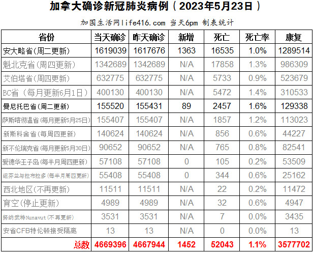 【加国生活网编译报道】截至2023年5月23日,加拿大新冠确诊病例总数为4669396(新增1452),死亡52043(新增23例),安省确诊总数1619039(一周新增1363,死亡新增21);曼省确诊总数155520(一周新增89,死亡新增2)。世界卫生组织正在就应对未来疫情的新条例进行谈判,目标日期是 2024 年 5 月,世卫组织的 194 个成员国将通过一项具有法律约束力的条例,旨在寻求加强全球对新病原体的防御。加国生活网专门制作了如下统计数据表:
