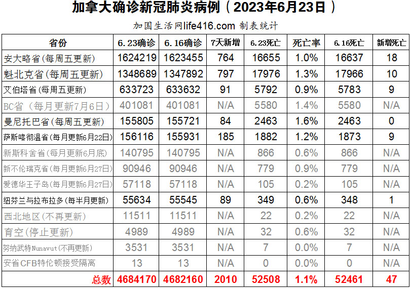 注意:由于加拿大各省纷纷转成每月更新数据,加国生活网的疫情报道从5月26日起变为每周一次报道,下次报道在6月30日星期五,多谢理解。