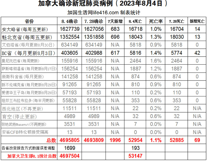 注意:由于加拿大各省纷纷转成每月更新数据,加国生活网的疫情报道从5月26日起变为每周一次报道,下次报道在8月11日星期五,多谢理解。