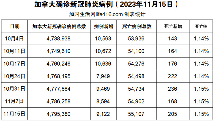 【加国生活网编译报道】截至2023年11月15日,加拿大新冠确诊病例总数为4,795,380(一周新增9,122),死亡55,107(一周新增205例)。随着着新冠确诊病例和呼吸道疾病确诊病例的激增,安省长期护理人员再次被要求佩戴口罩。口罩强制令新规定已经于 11 月 7 日生效,对工作人员、志愿者和支持人员产生影响,他们现在必须在所有居民区的室内佩戴口罩;加拿大统计局的一份新报告研究发现,在新冠疫情的最初几个月里,死于新冠的女性人数多于男性。加国生活网专门制作了如下统计数据表: