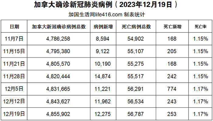 【加国生活网编译报道】截至2023年12月19日,加拿大新冠确诊病例总数为4,855,902(一周新增12,275),死亡56,787(一周新增253例)。四年了!是的,整整四年了!在历经了四年的新冠疫情后,医疗团队和科学家正在解决一系列在疫情期间处于次要地位的紧迫健康问题。在世界各地,研究人员正在探索突破性 CRISPR 基因疗法的新应用;科学家们还准备应对抗菌素耐药性和气候变化对人类健康的持续影响;由病毒学家、流行病学家和医生组成的团队正在竞相追踪病毒从动物传播到人类的情况,以期待能阻止下一次的全球疫情。加国生活网专门制作了如下统计数据表: