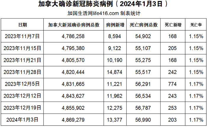 【加国生活网编译报道】截至2024年1月3日,加拿大新冠确诊病例总数为4,869,279(两周新增13,377),死亡56,990(两周新增203例)。最新的一项研究称,如果像流感疫苗一样给 60 岁及以上的人注射呼吸道合胞病毒(RSV) 疫苗,它将“大大”减少疾病和死亡。2024年1月2日,耶鲁大学研究人员发表在《临床传染病杂志》上的这项研究发现,如果 66% 的老年人接种 RSV 疫苗,就会减少医疗保健系统中的患者人数。加国生活网专门制作了如下统计数据表: