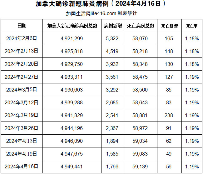 【加国生活网编译报道】截至2024年4月16日,加拿大新冠确诊病例总数为4,949,441(一周新增1,766),死亡59,139(一周新增56例)。BC省卫生部长Adrian Dix宣布启动春季新冠疫苗加强计划,特别建议老年人、55岁以上的原住民以及长期护理院居民接种加强剂新冠疫苗。他还表示,BC省正在改变医疗机构强制戴口罩的规定,随着报告的新冠病毒感染人数下降,医护人员不再需要在公共场所佩戴口罩;今年美国麻疹病例激增,截至4月4日,共录得7次疫情爆发和113例麻疹病例,83%病例涉及到未接种疫苗或接种情况不明的人。加国生活网专门制作了如下统计数据表:
