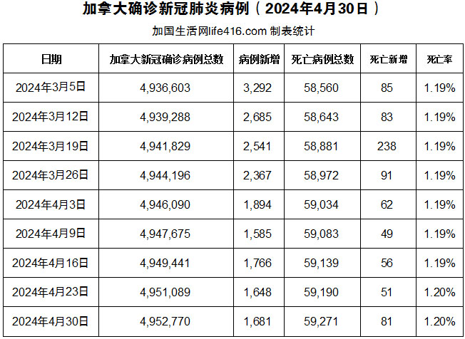 【加国生活网编译报道】截至2024年4月30日,加拿大新冠确诊病例总数为4,952,770(一周新增1,681),死亡59,271(一周新增81例)。加拿大各地的诺如病毒病例出人意料地上升,尤其是在安大略省和艾伯塔省等省份。据加拿大公共卫生部(PHAC)称,2024年报告病例激增超过五年历史平均水平。CTV在2024年4月29日的报道称,诺如病毒在加拿大的传播频率“高于医疗保健专业人员的预期”。这一上升与新冠疫情期间所报告的数字形成了鲜明对比,当时社会互动较少,传染病的传播率较低。加国生活网专门制作了如下统计数据表: