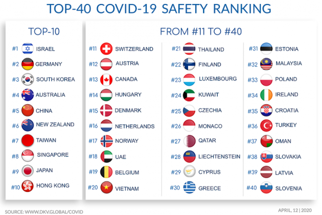 近日,由Deep Knowledge Group公布的一项世界各国COVID-19疫情分析排名的报告,吸引了不少人的注意。这一份国家地区排名报告于4月12日更新,涵盖有关COVID-19疫情的多个方面,包括风险级别、安全级别、有效治疗级别和政府支持力度等。