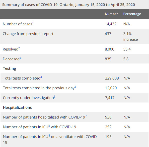 安省方面,截止4月25日上午10:30点,安省已对229638行了新冠病毒检测(检测数较昨天新增12020例),还有7417处于被调查阶段。确诊总数为14432例(比昨天增加了437,确诊率下降至3.6%),包括8000例康复、835例死亡(截止4月26日死亡又增加到948例,这是CBC统计的最新死亡数据,死亡率上升至6.6%,仍是加拿大死亡率最高省份)、住院患者938例(增加13)、进入ICU患者252例(增加7)、ICU插呼吸机患者195例(未变)。