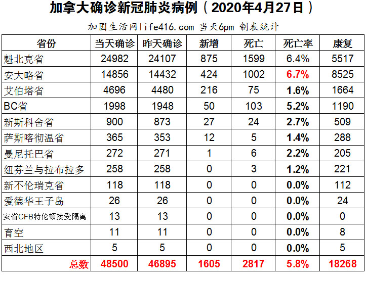【加国生活网编译报道】截至4月27日下午6点,加拿大共报告了48500例新冠肺炎病例,当天新增1605。魁省仍是确诊病例和死亡病例最多省份,确诊总数24982,死亡人数1599;安省仍排第二,确诊总数14856例,当日新增424,确诊率创两周新低,死亡总数1002例,死亡率为6.7%创新高。加拿大应急工资补贴开放申请;魁省和安省宣布应对新冠疫情的放宽限制措施计划。加国生活网专门制作了如下统计数据表: