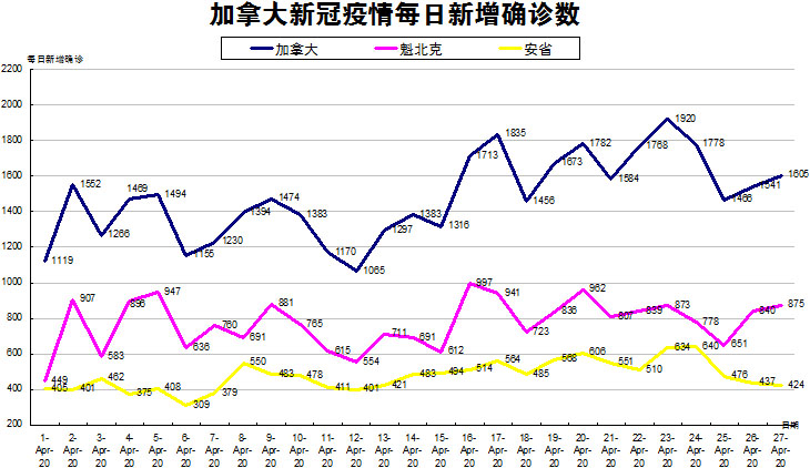 加国生活网小编统计了从4月1日至4月27日每日新增确诊数,制作了如下曲线图,分别统计了全加拿大(蓝色)和确诊数最多的两个省魁北克省(粉色)和安省(黄色)三组数据,大家可以了解一下进行4月份以来加拿大新冠疫情的发展趋势。加拿大、魁省在4月27日当日新增确诊数继续上升,而安省仍持续下降,无论是确诊数还是确诊率都是自两周以来的新低。希望这个下降趋势继续保持下去。