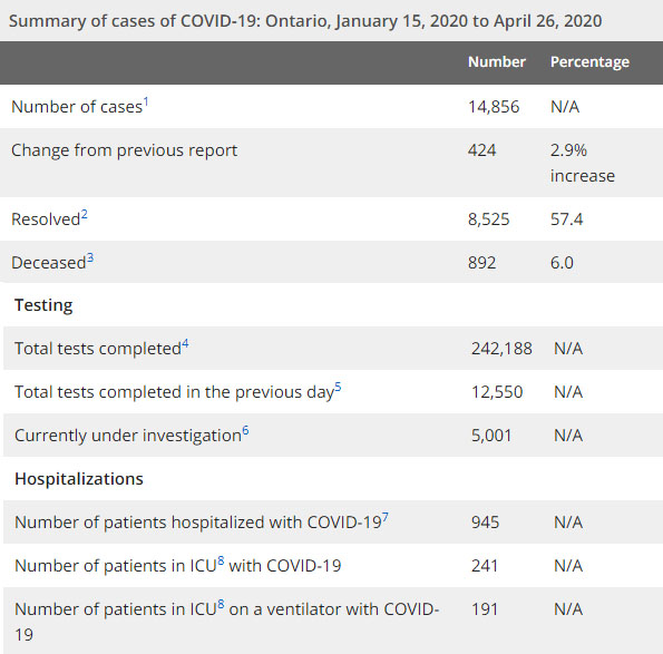安省方面,截止4月26日上午10:30点,安省已对242188行了新冠病毒检测(检测数较昨天新增12550例),还有5001处于被调查阶段。确诊总数为14856例(比昨天增加了424,确诊率下降至3.4%),包括8525例康复、892例死亡(截止4月27日死亡又增加到1002例,这是CBC统计的最新死亡数据,死亡率上升至6.7%创新高,且仍是加拿大死亡率最高省份)、住院患者945例(增加7)、进入ICU患者241例(减少11)、ICU插呼吸机患者191例(减少4)。