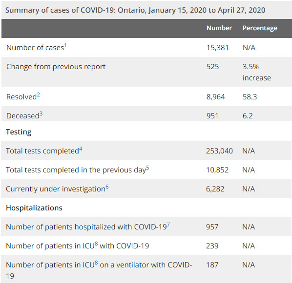 安省方面,截止4月27日上午10:30点,安省已对253040行了新冠病毒检测(检测数较昨天新增10852例),还有6282处于被调查阶段。确诊总数为15381例(比昨天增加了525,确诊率上升至4.8%),包括8964例康复、951例死亡(截止4月28日死亡又增加到1050例,这是CBC统计的最新死亡数据,死亡率上升至6.8%创新高,且仍是加拿大死亡率最高省份)、住院患者957例(增加12)、进入ICU患者239例(减少2)、ICU插呼吸机患者187例(减少4)。