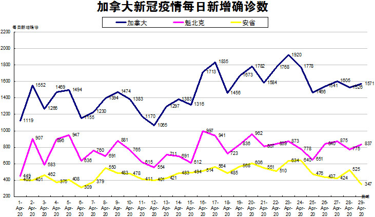 加国生活网小编统计了从4月1日至4月29日每日新增确诊数,制作了如下曲线图,分别统计了全加拿大(蓝色)和确诊数最多的两个省魁北克省(粉色)和安省(黄色)三组数据,大家可以了解一下进行4月份以来加拿大新冠疫情的发展趋势。加拿大、魁省在4月29日当日新增确诊数仍有所上升,而安省大大下降,创自4月7日以来新低!