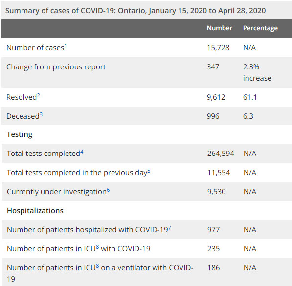安省方面,截止4月28日上午10:30点,安省已对264594行了新冠病毒检测(检测数较昨天新增11554例),还有9530处于被调查阶段。确诊总数为15728例(比昨天增加了347,创自4月6日以来新低,确诊率下降至3%),包括9612例康复、996例死亡(截止4月29日死亡又增加到1133例,这是CBC统计的最新死亡数据,死亡率上升至7.2%再创新高,且仍是加拿大死亡率最高省份)、住院患者977例(增加20)、进入ICU患者235例(减少4)、ICU插呼吸机患者186例(减少1)。