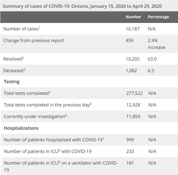 安省方面,截止4月29日上午10:30点,安省已对277522行了新冠病毒检测(检测数较昨天新增12928例),还有11859处于被调查阶段。确诊总数为16187例(比昨天增加了459,确诊率上升至3.6%),包括10205例康复、1082例死亡(截止4月30日死亡又增加到1177例,这是CBC统计的最新死亡数据,死亡率上升至7.3%继续创新高,且仍是加拿大死亡率最高省份)、住院患者999例(增加22)、进入ICU患者233例(减少2)、ICU插呼吸机患者181例(减少5)。