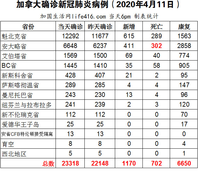 【加国生活网编译报道】截至4月11日下午6点,加拿大共报告了23318例确诊和推定新冠肺炎病例。魁北克省仍是确诊病例最多省份至12292例;安省仍排第二,当日新增411例,总数6648例,确诊率为11%,死亡人数全国第一为302。安省紧急状态至少延长至4月23日;安省卫生厅更新感染新冠病毒的新症状。加国生活网专门制作了如下统计数据表: