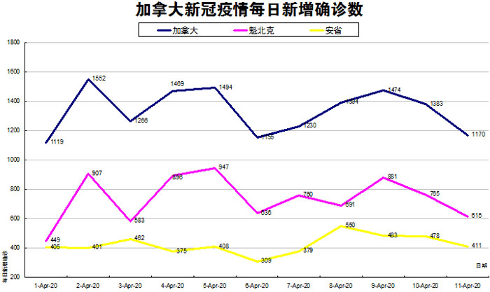 加国生活网小编统计了从4月1日至4月11日每日新增确诊数,制作了如下曲线图,分别统计了全加拿大(蓝色)和确诊数最多的两个省魁北克省(粉色)和安省(黄色)三组数据,大家可以了解一下进行4月份以来加拿大新冠疫情的发展趋势: