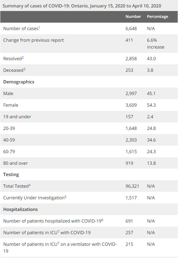 安省方面,截止4月10日上午10:30点,安省已对96321进行了新冠病毒检测(检测数较昨天新增3684例),还有1517处于被调查阶段。确诊总数为6648例(比昨天增加了411。确诊率11%,411/3684=0.11。),包括2858例康复、253例死亡(下午死亡又增加到302例,这是CBC统计的最新死亡数据,死亡率4.5%)、住院患者691例(增加18)、进入ICU患者257例(减少3)、ICU插呼吸机患者215例(减少2)。