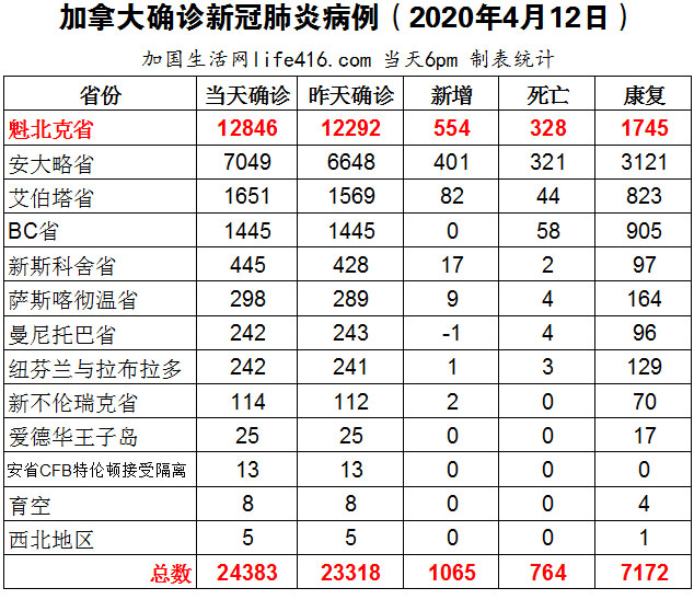 【加国生活网编译报道】截至4月12日下午6点,加拿大共报告了24383例确诊和推定新冠肺炎病例。魁北克省是确诊病例和死亡病例最多省份,总数12846例,死亡328例;安省仍排第二,当日新增401例,总数7049例,确诊率为11%。看加拿大新冠疫情统计曲线图,从4月9日至12日每日新增确诊数正逐渐下降,但愿一直降下去!加国生活网专门制作了如下统计数据表: