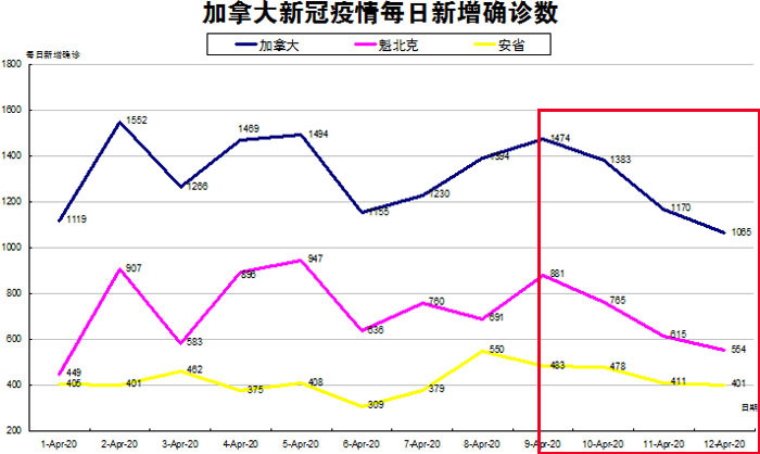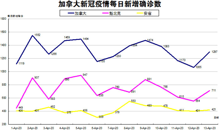 加国生活网小编统计了从4月1日至4月13日每日新增确诊数,制作了如下曲线图,分别统计了全加拿大(蓝色)和确诊数最多的两个省魁北克省(粉色)和安省(黄色)三组数据,大家可以了解一下进行4月份以来加拿大新冠疫情的发展趋势。看如下曲线图,虽然从4月9日至12日,加拿大每日新增确诊数正逐渐下降,但4月13日又有所抬头,小编分析这有可能和4月9日至12日是加拿大复活节假期有关。