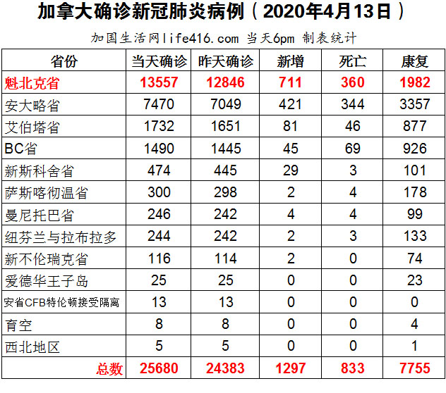 【加国生活网编译报道】截至4月13日下午6点,加拿大共报告了25680例确诊和推定新冠肺炎病例。魁北克省仍是确诊病例和死亡病例最多省份,总数13557例,死亡360例;安省仍排第二,当日新增421例,总数7470例,确诊率为8.3%。看加拿大新冠疫情统计曲线图,4月13日新增确诊数又有所抬头;加拿大已有超过350万人申请紧急福利金CERB;安省省长福特想将安省紧急状态延长28天。加国生活网专门制作了如下统计数据表: