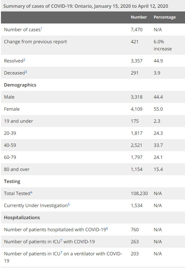 安省方面,截止4月12日上午10:30点,安省已对108230进行了新冠病毒检测(检测数较昨天新增5065例),还有1534处于被调查阶段。确诊总数为7470例(比昨天增加了421。确诊率8.3%,421/5065=0.083),包括3357例康复、291例死亡(下午死亡又增加到344例,这是CBC统计的最新死亡数据,死亡率4.6%,344/7470=0.046)、住院患者760例(增加22)、进入ICU患者263例(增加2)、ICU插呼吸机患者203例(增加7)。