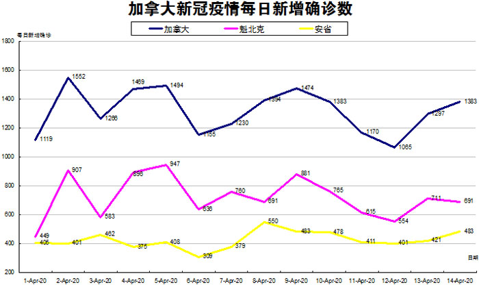 加国生活网小编统计了从4月1日至4月14日每日新增确诊数,制作了如下曲线图,分别统计了全加拿大(蓝色)和确诊数最多的两个省魁北克省(粉色)和安省(黄色)三组数据,大家可以了解一下进行4月份以来加拿大新冠疫情的发展趋势。
