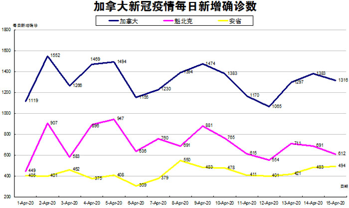 加国生活网小编统计了从4月1日至4月15日每日新增确诊数,制作了如下曲线图,分别统计了全加拿大(蓝色)和确诊数最多的两个省魁北克省(粉色)和安省(黄色)三组数据,大家可以了解一下进行4月份以来加拿大新冠疫情的发展趋势。