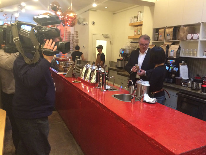 图示安省劳工厅厅长斐廉恩探访HotBlack Coffee时与员工交谈,了解他们对省府将最低时薪提高的意见。